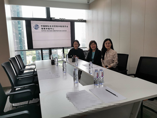 (自左向右:貿(mào)仲海南仲裁中心秘書長王文英、獨(dú)任仲裁員岳潔、案件經(jīng)辦人余婷)