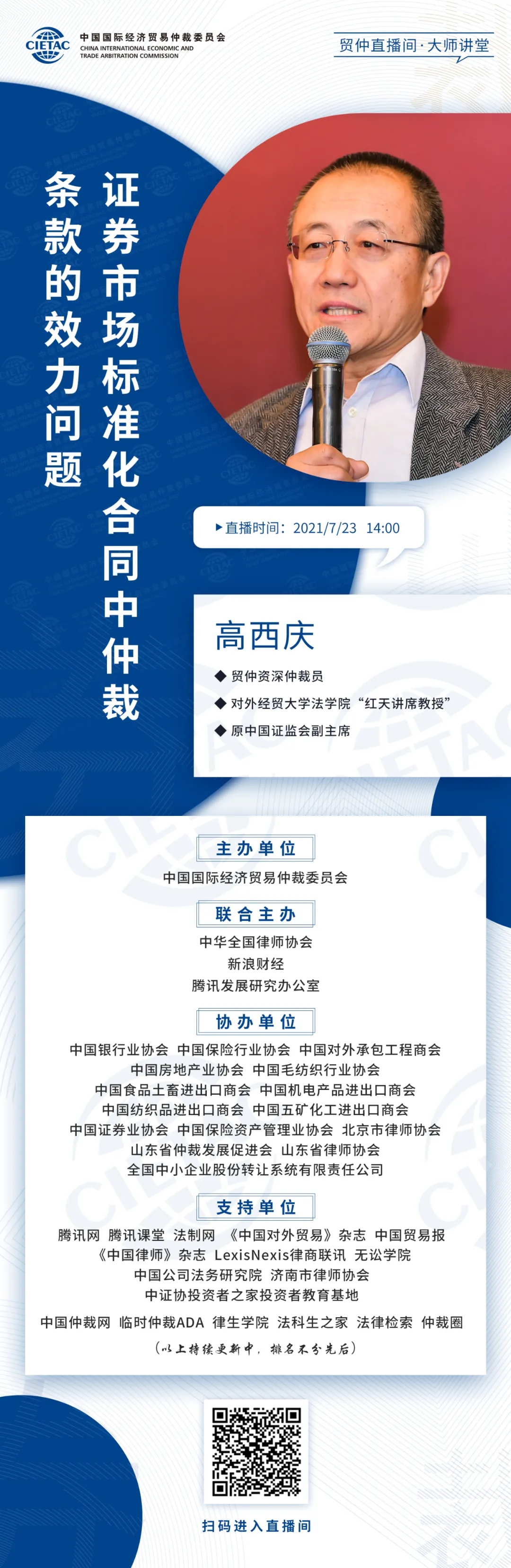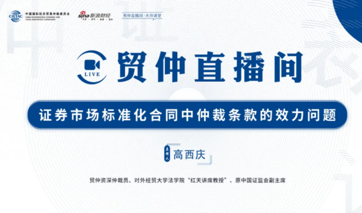 貿(mào)仲直播間-大師講堂系列課程第六講將于2021年7月23日(星期五)下午2時,邀請原中國證監(jiān)會副主席、全國社?;鹄硎聲崩硎麻L,現(xiàn)貿(mào)仲資深仲裁員、對外經(jīng)貿(mào)大學(xué)法學(xué)院“紅天講席教授”高西慶教授,講解“證券市場標準化合同中仲裁條款的效力問題”。