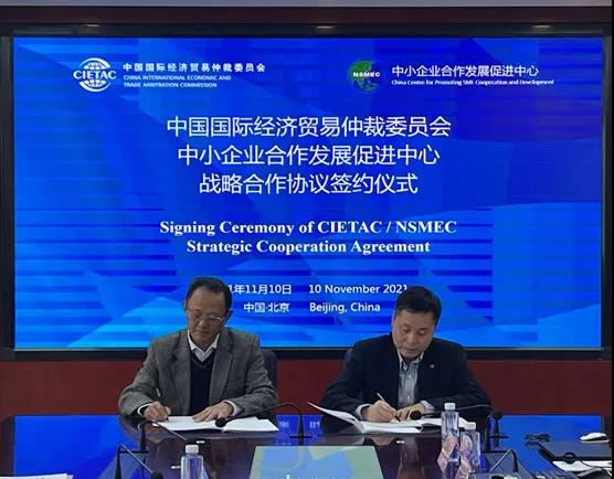 2021年11月10日,中國國際經(jīng)濟貿(mào)易仲裁委員會(“貿(mào)仲”)與中小企業(yè)合作發(fā)展促進中心(“中促中心”)戰(zhàn)略合作協(xié)議簽約儀式在北京成功舉行。貿(mào)仲王承杰副主任兼秘書長、中促中心黎志明主任代表雙方在戰(zhàn)略合作協(xié)議上簽字。