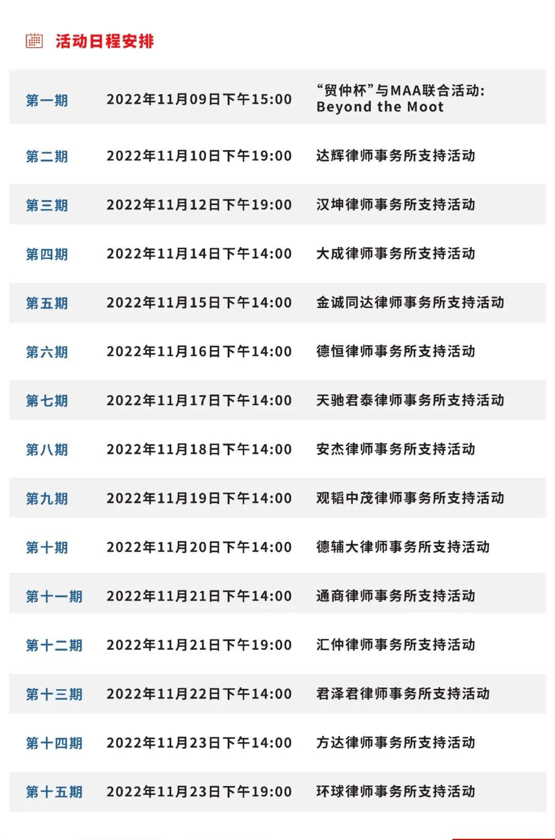 第二十屆“貿(mào)仲杯”國際商事仲裁模擬仲裁庭辯論賽Voice of Moot 系列培訓(xùn)活動將于2022年11月9日開始,至11月23日結(jié)束,共計(jì)15期相關(guān)活動?!百Q(mào)仲杯”辯論賽自2000年舉辦至今已歷經(jīng)十九屆,辯論賽始終秉持培養(yǎng)具備國際化實(shí)務(wù)能力的涉外仲裁法治人才的初心,匯集了大批國際仲裁法律人才。