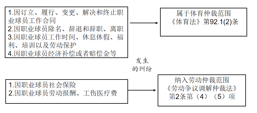 (2)因A.訂立、履行、變更、解決和終止職業(yè)球員工作合同、B.職業(yè)球員除名、辭退和辭職、離職、C.因職業(yè)球員工作時間、休息休假、福利、培訓(xùn)以及勞動保護(hù)發(fā)生糾紛,納入體育仲裁范圍