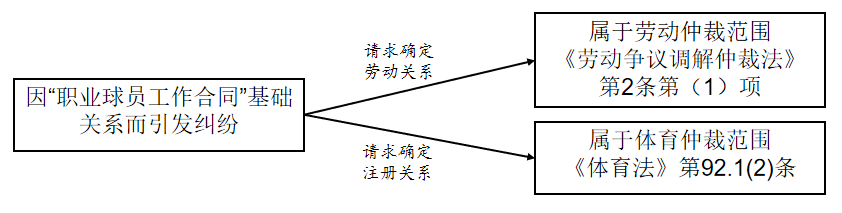 職業(yè)球員是俱樂部勞動者,但是從事特殊勞動勞動者,因此職業(yè)球員不僅具有勞動者身份,也是球員的特殊勞動者身份。因此,依據(jù)球員訴請的內(nèi)容,來判斷管轄:如請求確認勞動者身份,即勞動關系確認(勞動爭議調(diào)解仲裁法第二條第(1)項“因確認勞動關系發(fā)生的爭議”),屬于勞動仲裁范圍;如請求確認球員身份(特殊勞動者),即要求明確球員的注冊身份問題(體育法第九十二條第1款第(2)項“因運動員注冊、交流發(fā)生的糾紛”),則屬于體育仲裁范圍,如下圖。