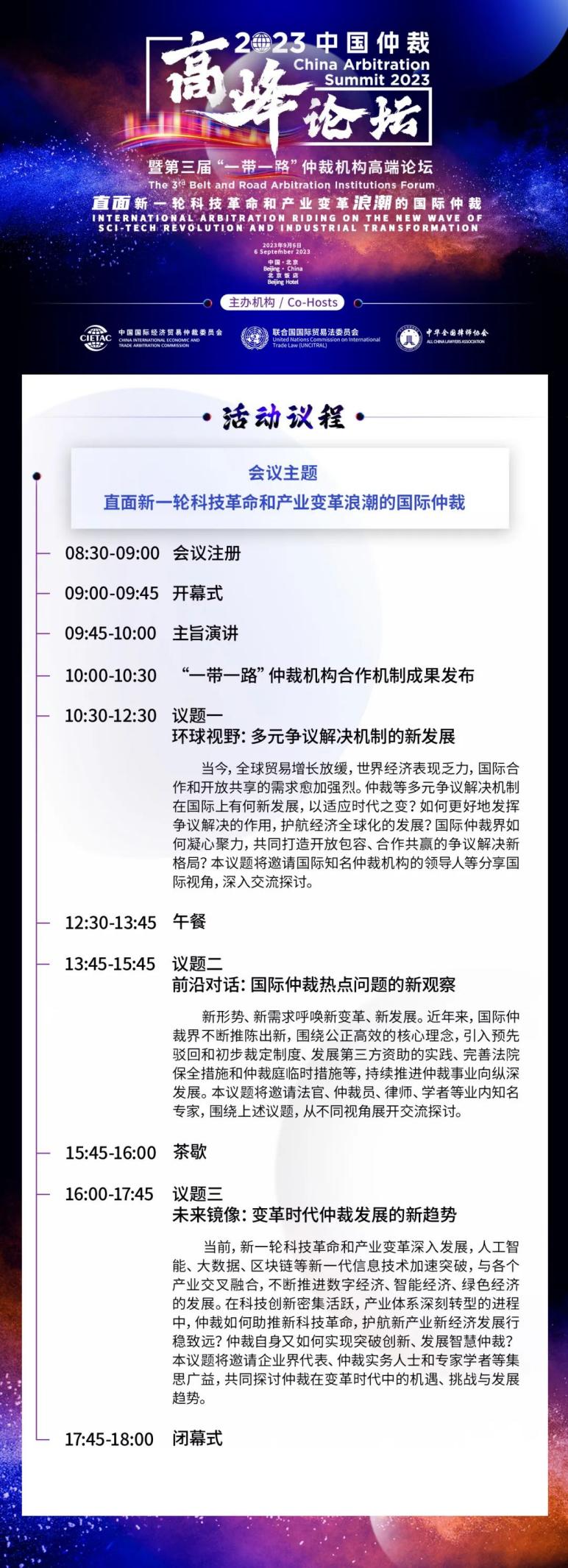 本屆論壇以“直面新一輪科技革命和產(chǎn)業(yè)變革浪潮的國際仲裁”為主題,攜手全球仲裁法律專家聚焦新時(shí)代背景下的前沿?zé)狳c(diǎn),就國際仲裁的實(shí)踐經(jīng)驗(yàn)和最新成果展開交流對話,展望國際爭端解決的未來發(fā)展方向。同時(shí),值“一帶一路”倡議提出十周年之際,為進(jìn)一步凝聚法治共識(shí)、增進(jìn)法治互信、深化法治交流,將同期舉辦第三屆“一帶一路”仲裁機(jī)構(gòu)高端論壇,推動(dòng)共建“一帶一路”高質(zhì)量發(fā)展。