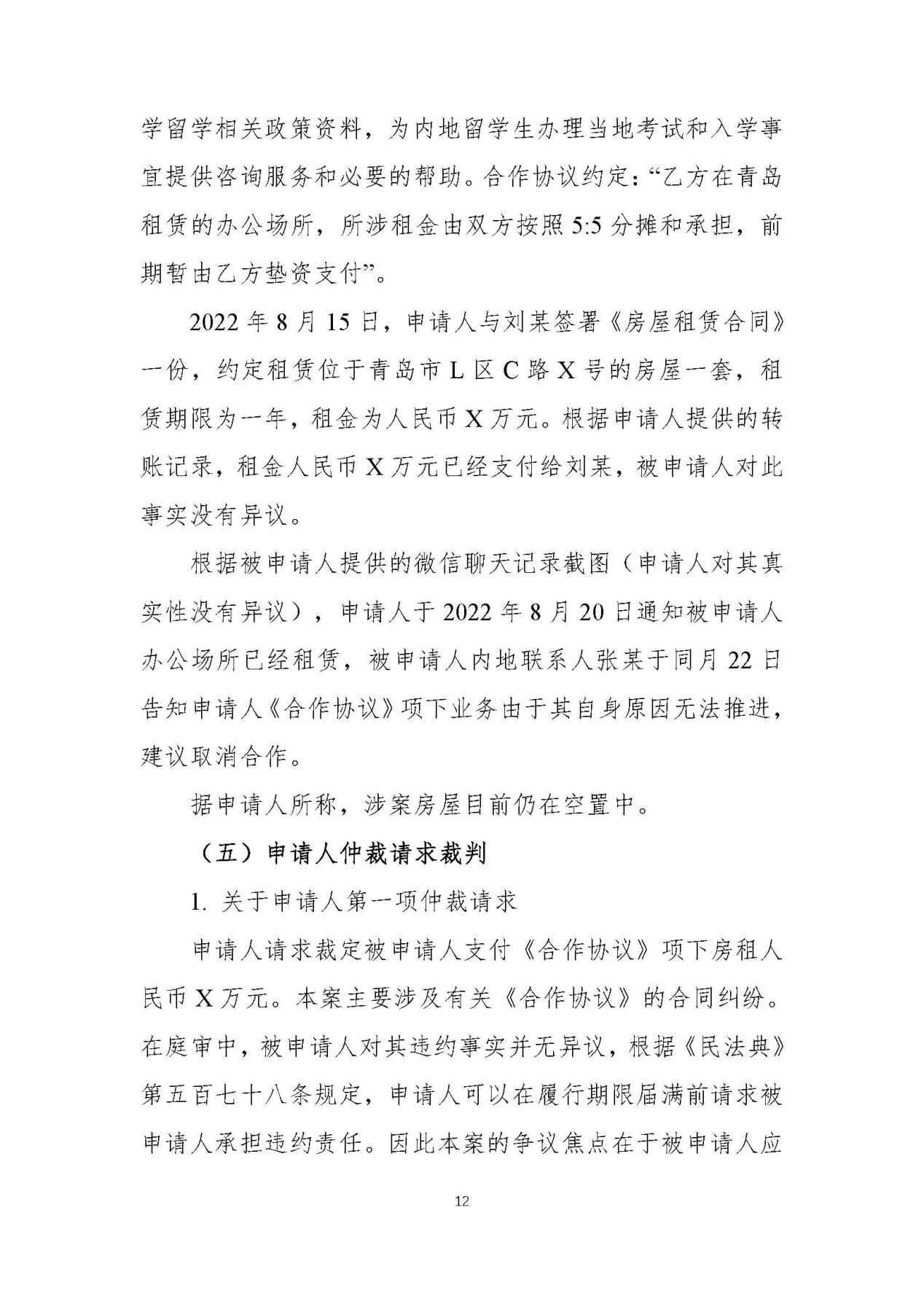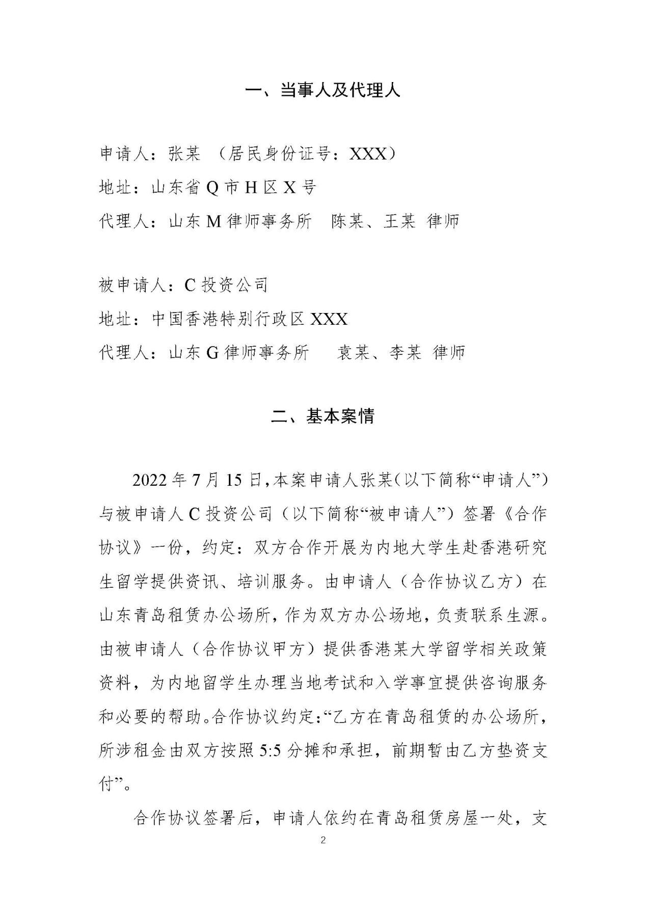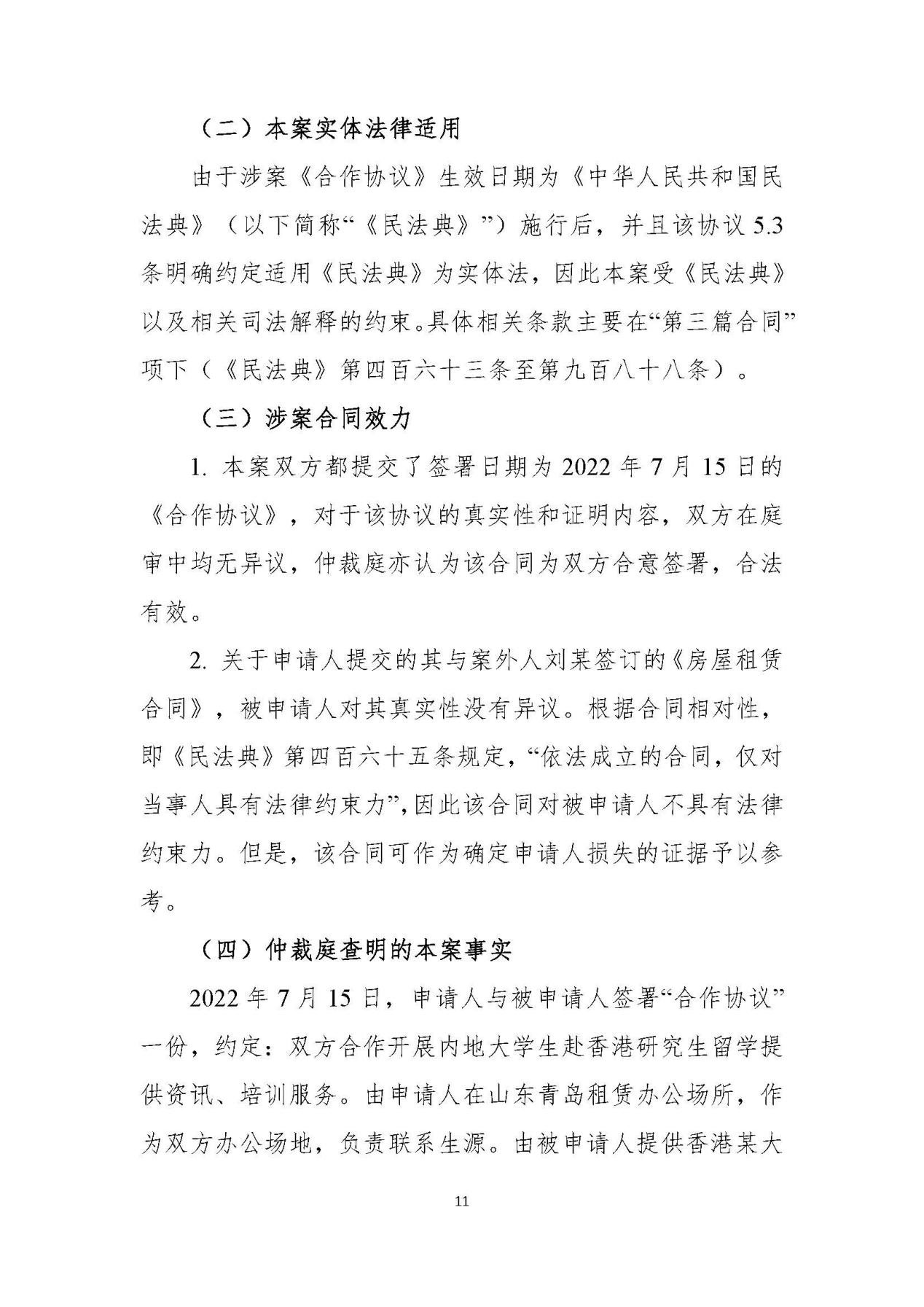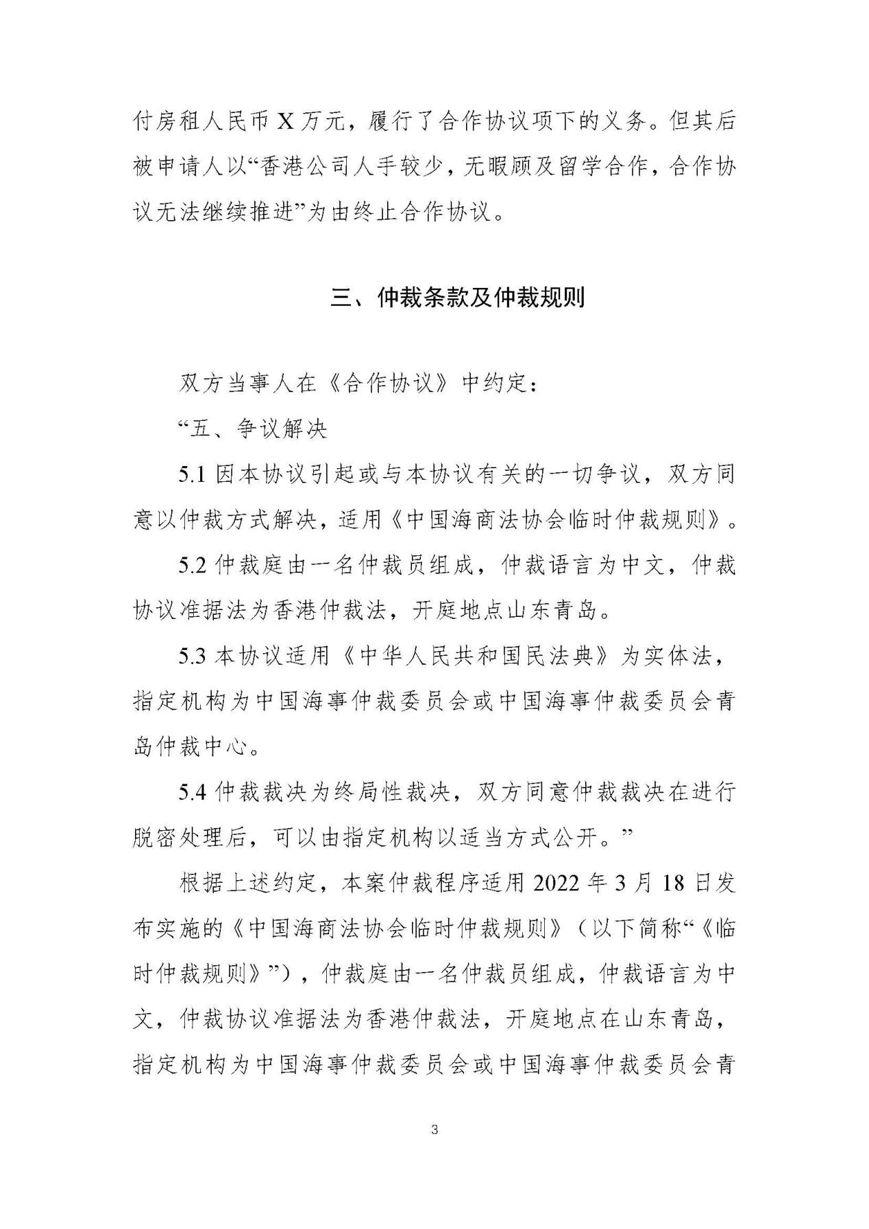 案件涉及一起跨境合作協(xié)議糾紛,申請人為中國內(nèi)地居民,被申請人為中國香港公司。雙方約定合作開展為內(nèi)地大學(xué)生赴香港研究生留學(xué)提供資訊、培訓(xùn)服務(wù)。雙方因合作協(xié)議的履行產(chǎn)生爭議。本案合作協(xié)議“爭議解決”條款明確約定:“因本協(xié)議引起或與本協(xié)議有關(guān)的一切爭議,雙方同意以仲裁方式解決,適用《中國海商法協(xié)會臨時仲裁規(guī)則》?!薄爸俨猛ビ梢幻俨脝T組成,仲裁語言為中文,仲裁協(xié)議準(zhǔn)據(jù)法為香港仲裁法,開庭地點山東青島?!薄氨緟f(xié)議適用《中華人民共和國民法典》為實體法,指定機構(gòu)為中國海事仲裁委員會或中國海事仲裁委員會青島仲裁中心?!薄爸俨貌脹Q為終局性裁決,雙方同意仲裁裁決在進行脫密處理后,可以由指定機構(gòu)以適當(dāng)方式公開?!?/p>