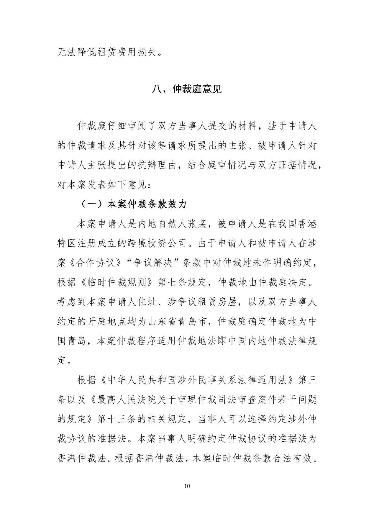 作為境內(nèi)首起適用《海協(xié)臨時仲裁規(guī)則》的案件,其臨時仲裁條款的效力備受關(guān)注。仲裁庭專此在裁決書中予以論述。仲裁庭從案件涉港糾紛的性質(zhì)出發(fā),依據(jù)雙方當(dāng)事人未明確約定仲裁地的事實,根據(jù)《海協(xié)臨時仲裁規(guī)則》有關(guān)“仲裁地”的規(guī)定,考慮到申請人住址、涉爭議租賃房屋,以及雙方當(dāng)事人約定的開庭地均位于山東省青島市,首先確定案件仲裁地為中國青島,明確案件仲裁程序適用仲裁地法即中國內(nèi)地仲裁法律規(guī)定;繼而根據(jù)《中華人民共和國涉外民事關(guān)系法律適用法》以及《最高人民法院關(guān)于審理仲裁司法審查案件若干問題的規(guī)定》有關(guān)“當(dāng)事人可以選擇約定涉外仲裁協(xié)議的準(zhǔn)據(jù)法”的規(guī)定,依據(jù)雙方當(dāng)事人明確約定仲裁協(xié)議的準(zhǔn)據(jù)法為香港仲裁法的事實,認定本案臨時仲裁條款合法有效。