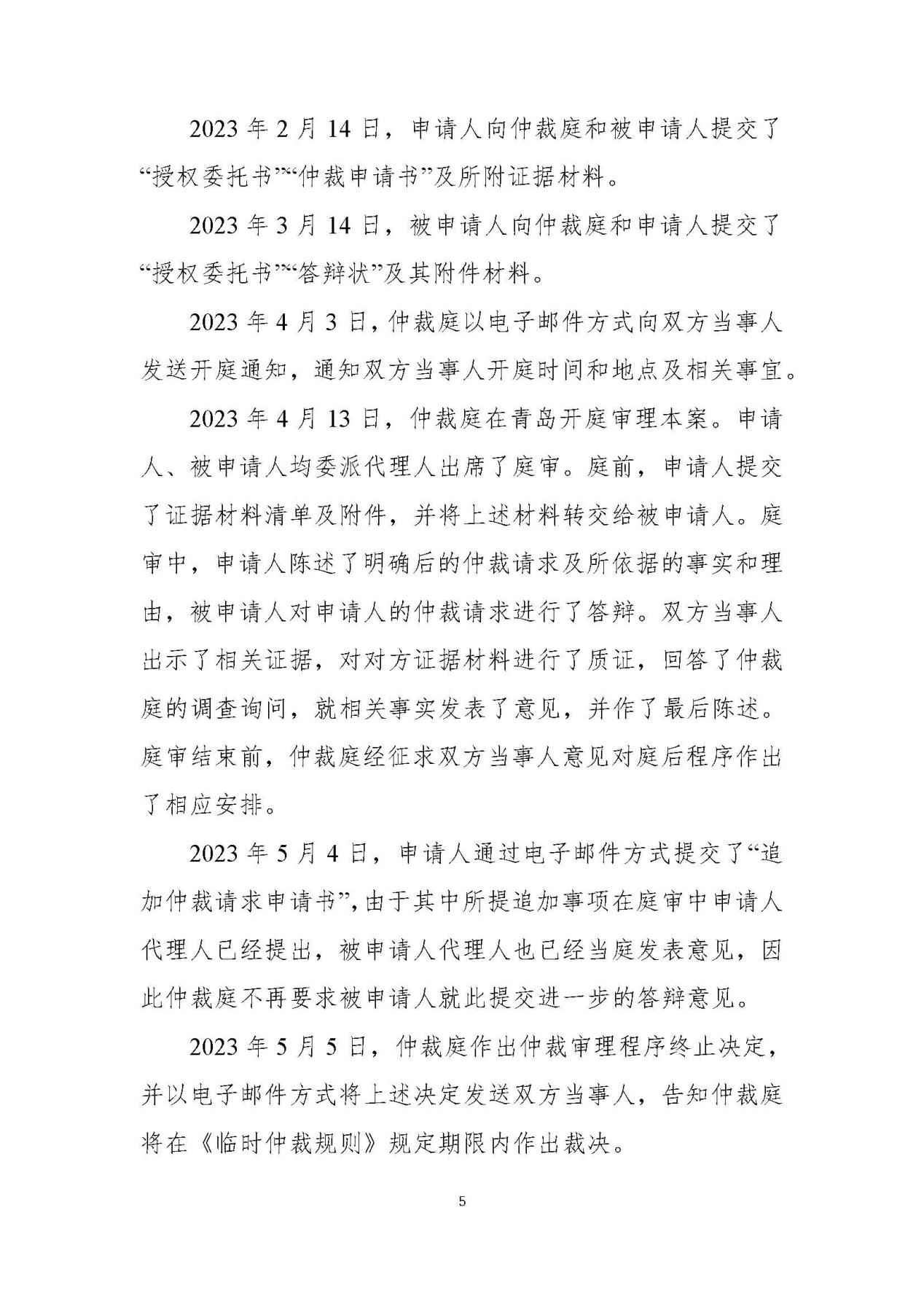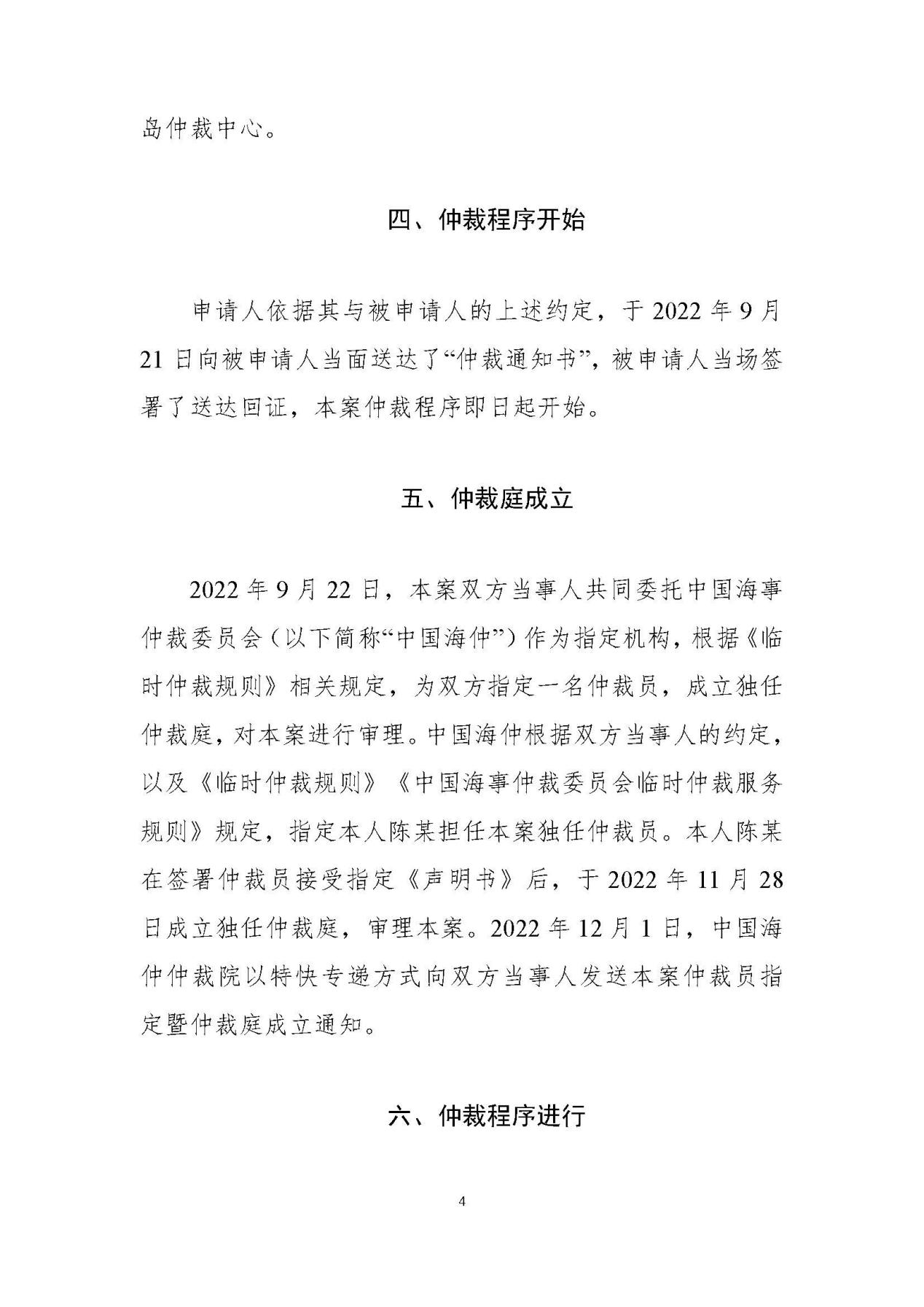 根據(jù)上述約定,申請人按照《海協(xié)臨時仲裁規(guī)則》規(guī)定,于2022年9月21日向被申請人發(fā)送“仲裁通知書”,被申請人簽署確認,仲裁程序自此開始。在仲裁程序中,由于雙方當(dāng)事人未能就仲裁員的選定達成一致意見,雙方共同申請由中國海仲為本案指定一名仲裁員,成立仲裁庭,進行審理。根據(jù)雙方當(dāng)事人約定及《海協(xié)臨時仲裁規(guī)則》《中國海仲臨時仲裁服務(wù)規(guī)則》規(guī)定,中國海仲為該案指定一名仲裁員,成立仲裁庭。此后案件程序全部由仲裁庭依據(jù)《海協(xié)臨時仲裁規(guī)則》主持進行。仲裁庭于2023年4月13日在中國海仲青島仲裁中心開庭審理本案,5月5日作出仲裁審理程序終止決定,6月30日作出仲裁裁決。
