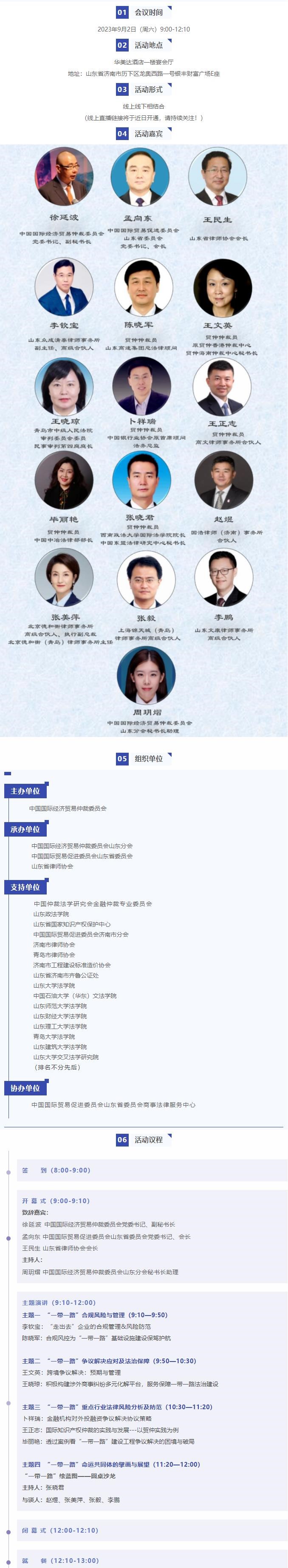 為加強“一帶一路”法治保障,提升風(fēng)險防范和解決爭議的能力,茲定于2023年9月2日在山東濟南舉辦“‘一帶一路’繪藍圖,十載征程再啟航--國際商事仲裁高端論壇”。屆時,我們將在“一帶一路”鋪排的萬里畫卷上,在商事仲裁深耕的廣闊天地中,探討多個前沿主題,聚焦法律服務(wù)的多元化發(fā)展,現(xiàn)誠邀您蒞臨參會。