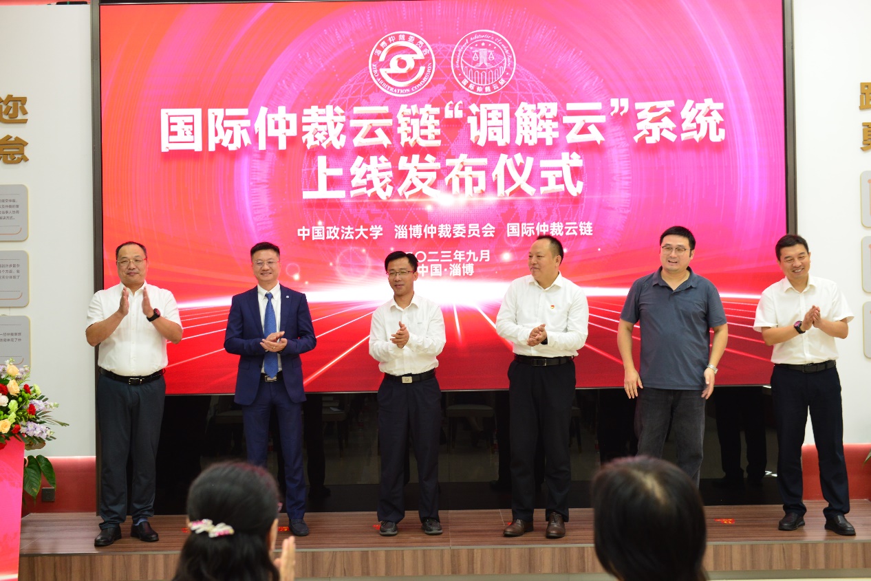 山東省司法廳一級(jí)調(diào)研員李世敏,淄博仲裁辦黨組書記、主任張公博,淄博仲裁辦黨組成員、副主任閆世學(xué),中國政法大學(xué)副教授、國際仲裁云鏈理事會(huì)副理事長周蔚,中國政法大學(xué)網(wǎng)絡(luò)安全和信息化辦公室副主任張軼舸,泰杭律師事務(wù)所主任、國際仲裁云鏈理事會(huì)理事汪政共同為調(diào)解云系統(tǒng)上線揭牌。