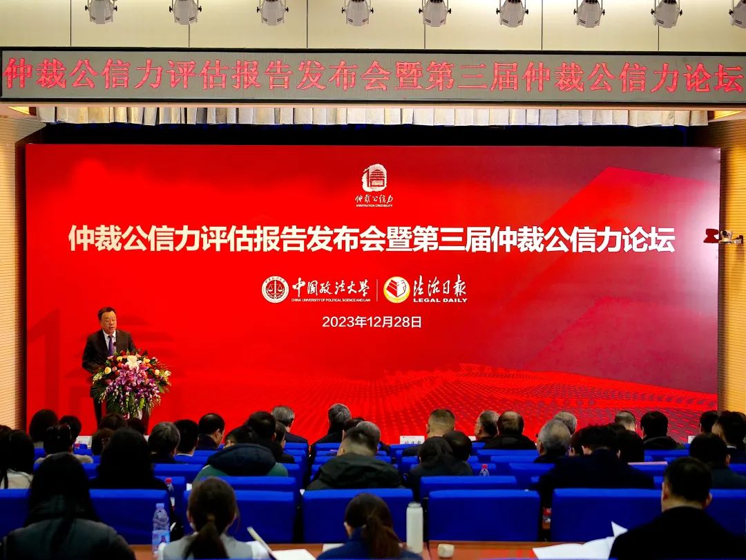 2023年12月28日,仲裁公信力評(píng)估報(bào)告發(fā)布會(huì)暨第三屆仲裁公信力論壇在中國政法大學(xué)舉行。全國人大常委會(huì)法制工作委員會(huì)民法室副主任馬正平,司法部公共法律服務(wù)管理局局長楊向斌,最高人民法院法官張梅等國家機(jī)關(guān)代表蒞臨發(fā)布會(huì)。中國政法大學(xué)副校長時(shí)建中,中國法學(xué)會(huì)副會(huì)長、中國政法大學(xué)仲裁研究院理事長黃進(jìn),全國人大常委會(huì)法制工作委員會(huì)民法室原主任賈東明,司法部公共法律服務(wù)管理局二級(jí)巡視員石海,法制日?qǐng)?bào)社編委、法治網(wǎng)總裁萬學(xué)忠以及專家委員會(huì)成員出席發(fā)布會(huì)。全國多家仲裁機(jī)構(gòu)領(lǐng)導(dǎo)、律師與企業(yè)代表、高??蒲腥藛T以及媒體代表參會(huì)。