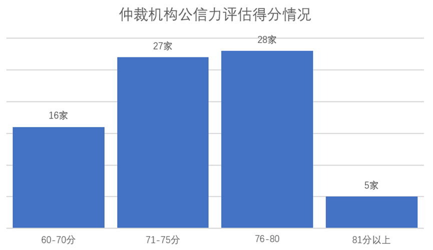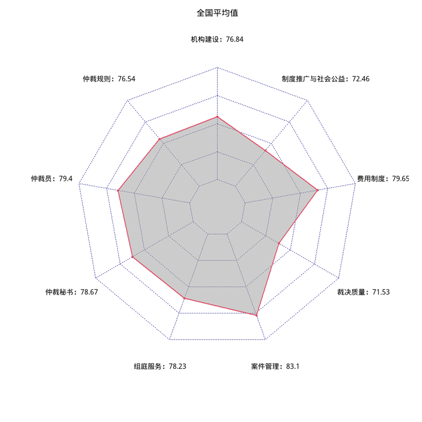 從一級(jí)指標(biāo)得分情況來看,受調(diào)研仲裁機(jī)構(gòu)表現(xiàn)較好的指標(biāo)是案件管理。該指標(biāo)主要依據(jù)是仲裁用戶的主觀滿意度評(píng)價(jià)。這表明機(jī)構(gòu)所在地的當(dāng)事人對(duì)本地機(jī)構(gòu)的評(píng)價(jià)較高。我國仲裁發(fā)展不平衡,仲裁資源本地化程度較高,滿意度指標(biāo)橫向可比性較低。該指標(biāo)主要反映機(jī)構(gòu)所在地當(dāng)事人對(duì)該仲裁機(jī)構(gòu)的看法。一級(jí)指標(biāo)中得分最低的是仲裁裁決,僅為71.5分。仲裁裁決指標(biāo)的評(píng)估標(biāo)準(zhǔn)主要是當(dāng)事人向法院申請(qǐng)撤銷仲裁裁決與仲裁機(jī)構(gòu)受案數(shù)量比、法院實(shí)際撤裁與當(dāng)事人申請(qǐng)撤裁案件數(shù)量比以及法院實(shí)際撤裁案件與仲裁機(jī)構(gòu)受理案件數(shù)量比。該項(xiàng)指標(biāo)評(píng)估依據(jù)來源權(quán)威,效度較高,可以部分反映仲裁公信力建設(shè)的實(shí)際情況。