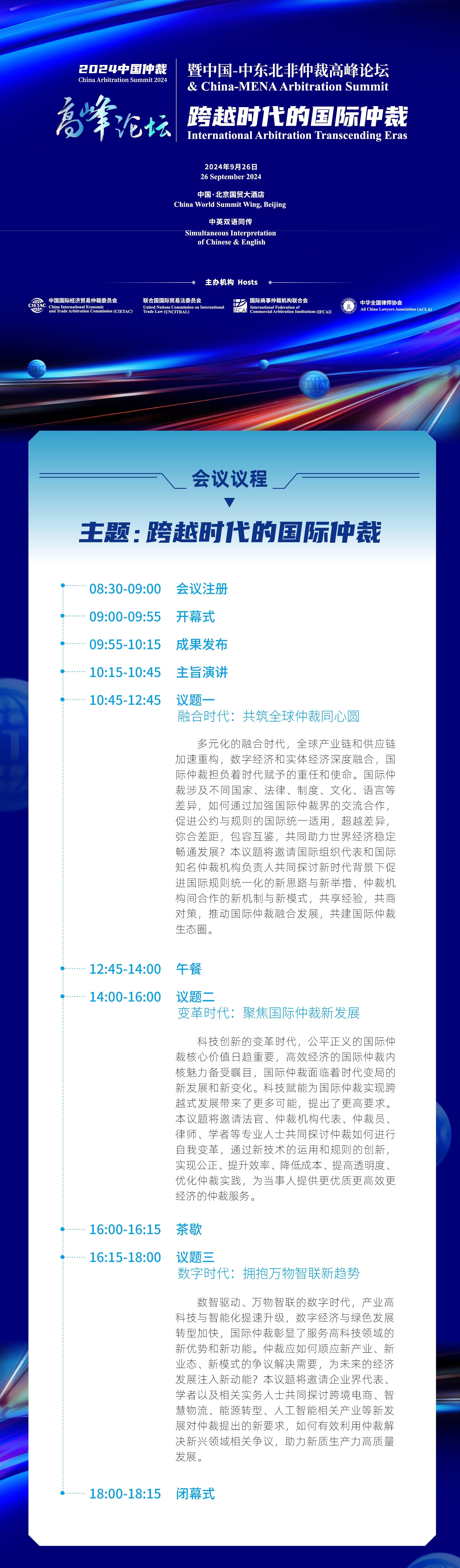 由中國(guó)國(guó)際經(jīng)濟(jì)貿(mào)易仲裁委員會(huì)(CIETAC)、聯(lián)合國(guó)國(guó)際貿(mào)易法委員會(huì)(UNCITRAL)、國(guó)際商事仲裁機(jī)構(gòu)聯(lián)合會(huì)(IFCAI)以及中華全國(guó)律師協(xié)會(huì)(ACLA)聯(lián)合舉辦的2024中國(guó)仲裁高峰論壇暨中國(guó)-中東北非仲裁高峰論壇將于2024年9月26日在北京舉辦。