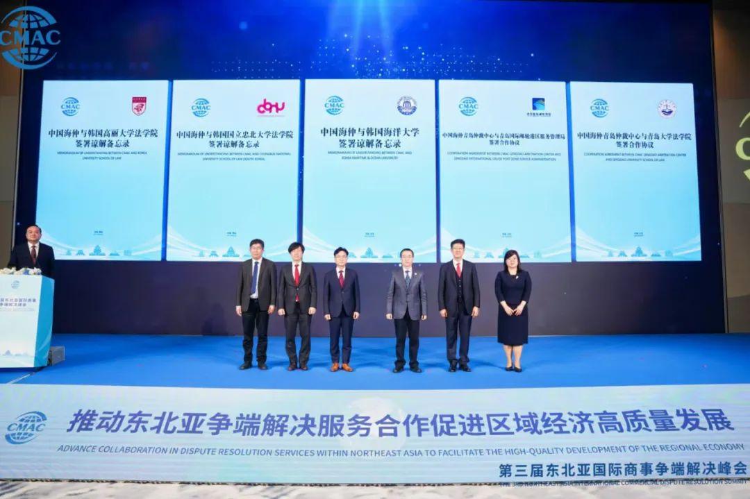 開幕式后,在現(xiàn)場嘉賓見證下,中國海仲分別與韓國海事海洋大學(xué)、韓國高麗大學(xué)法學(xué)院、韓國國立忠北大學(xué)法學(xué)院簽署諒解備忘錄;中國海仲青島仲裁中心分別與青島國際郵輪港區(qū)服務(wù)管理局、青島大學(xué)法學(xué)院簽訂合作協(xié)議。成果發(fā)布環(huán)節(jié)由山東省貿(mào)促會(huì)會(huì)長孟向東主持。