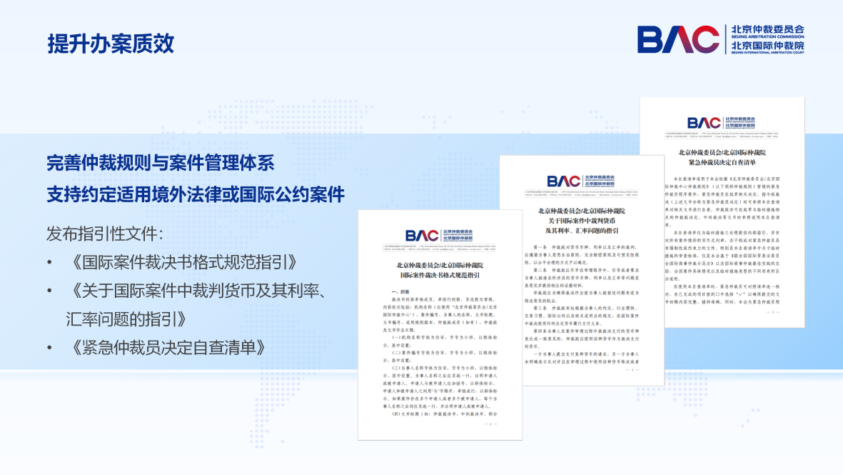 近五年來,北仲處理了大量約定適用境外法律或國際公約,以及以外語為仲裁語言的案件,具備處理復雜國際商事爭議的全球化思維及豐富的經(jīng)驗,能夠滿足境內外當事人的多元爭議解決需求。北仲還發(fā)布了與國際主流實踐接軌的指引性文件并在實踐中廣泛適用,比如發(fā)布了《國際案件裁決書格式規(guī)范指引》《關于國際案件中裁判貨幣及其利率、匯率問題的指引》《緊急仲裁員決定自查清單》等。