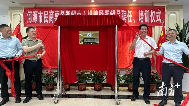 河源市司法局黨組書記、局長李慶鐸,河源市民政局黨組成員、二級(jí)調(diào)研員李琦,河源市民商事務(wù)調(diào)解中心理事長、河源仲裁委員會(huì)主任藍(lán)鋒,河源市民商事務(wù)調(diào)解中心秘書長吳松為調(diào)解中心揭牌。
