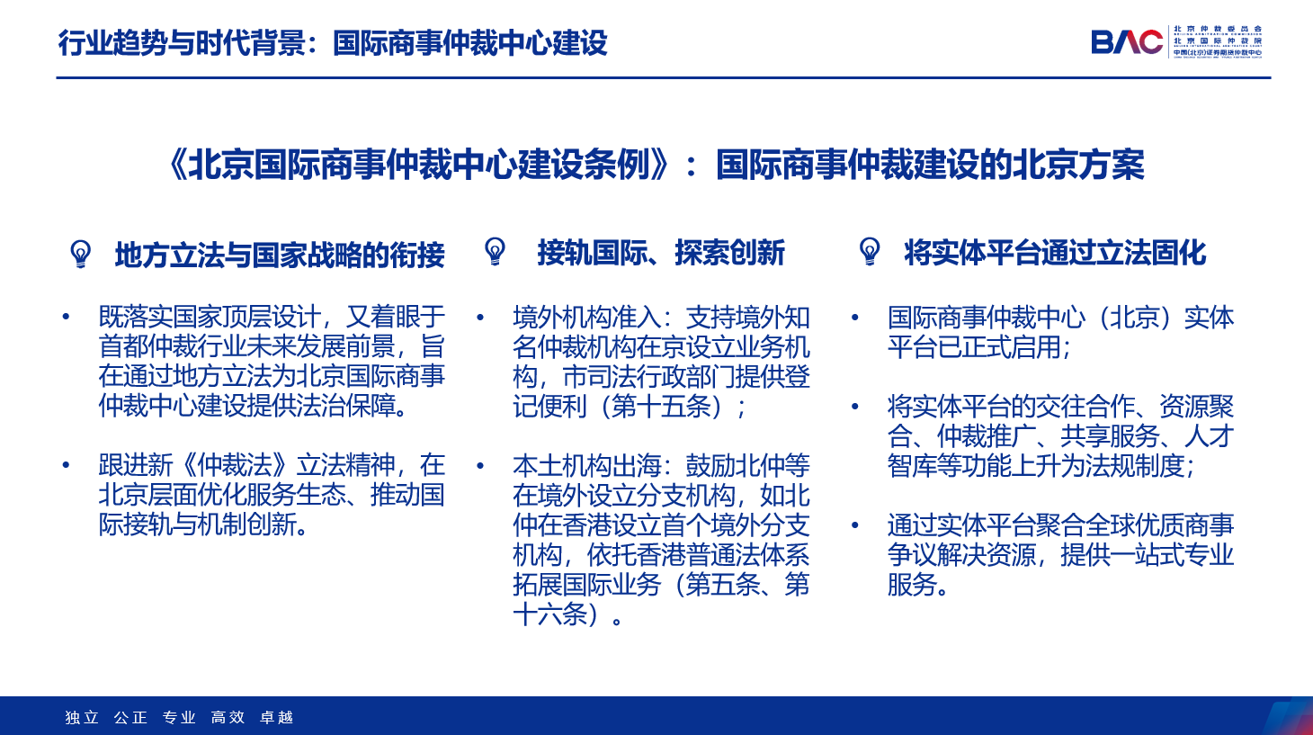《條例》于2025年9月26日經(jīng)北京市十六屆人大常委會第十九次會議表決通過,提出了國際商事仲裁中心建設(shè)的總體要求,包括優(yōu)化仲裁發(fā)展環(huán)境,支持仲裁改革創(chuàng)新,建設(shè)仲裁制度接軌國際、資源優(yōu)質(zhì)集聚、機構(gòu)國際一流、服務(wù)專業(yè)高效、司法保障優(yōu)良的國際商事仲裁中心,旨在打造國際商事爭議解決和法律服務(wù)優(yōu)選地,提升涉外法治保障和服務(wù)水平,助力北京營造市場化、法治化、國際化一流營商環(huán)境。