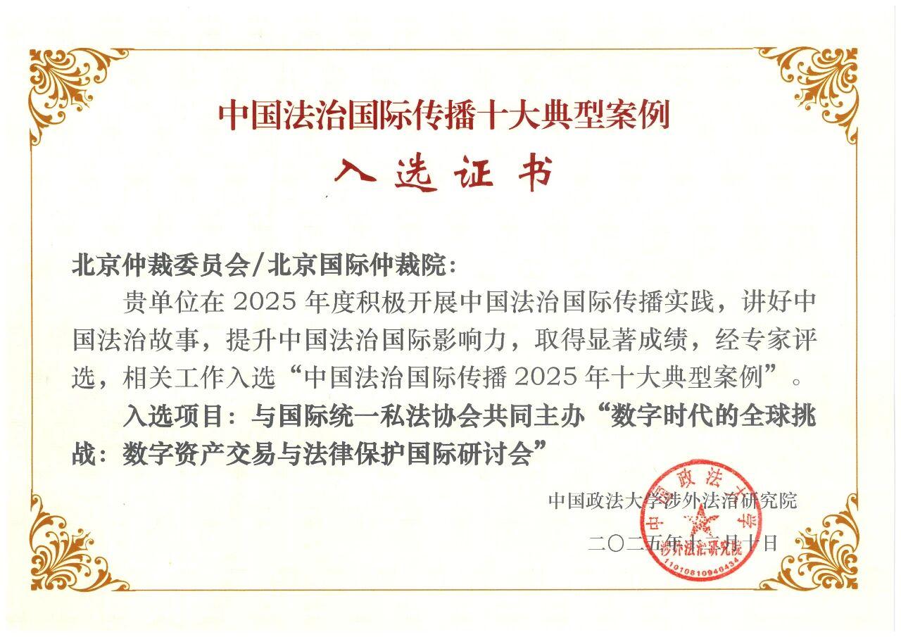 為加強中國法治的國際傳播,統(tǒng)籌推進(jìn)國內(nèi)法治與涉外法治,中國政法大學(xué)涉外法治研究院組織評選并發(fā)布了2025年“中國法治國際傳播十大典型案例”。北京仲裁委員會/北京國際仲裁院/中國(北京)證券期貨仲裁中心(以下稱“北仲”)與國際統(tǒng)一私法協(xié)會(UNIDROIT)、北京國際爭議解決發(fā)展中心共同主辦的“數(shù)字時代的全球挑戰(zhàn):數(shù)字資產(chǎn)交易與法律保護(hù)”國際研討會成功入選。這是繼2020年北仲舉辦的中國商事爭議解決年度觀察海外發(fā)布會入選2020“中國法治國際傳播十大典型案例”后,北仲實踐再次入選。