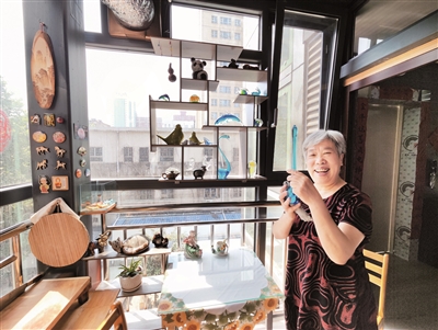 在加裝電梯后增加的“陽光房”內(nèi),居民笑逐顏開