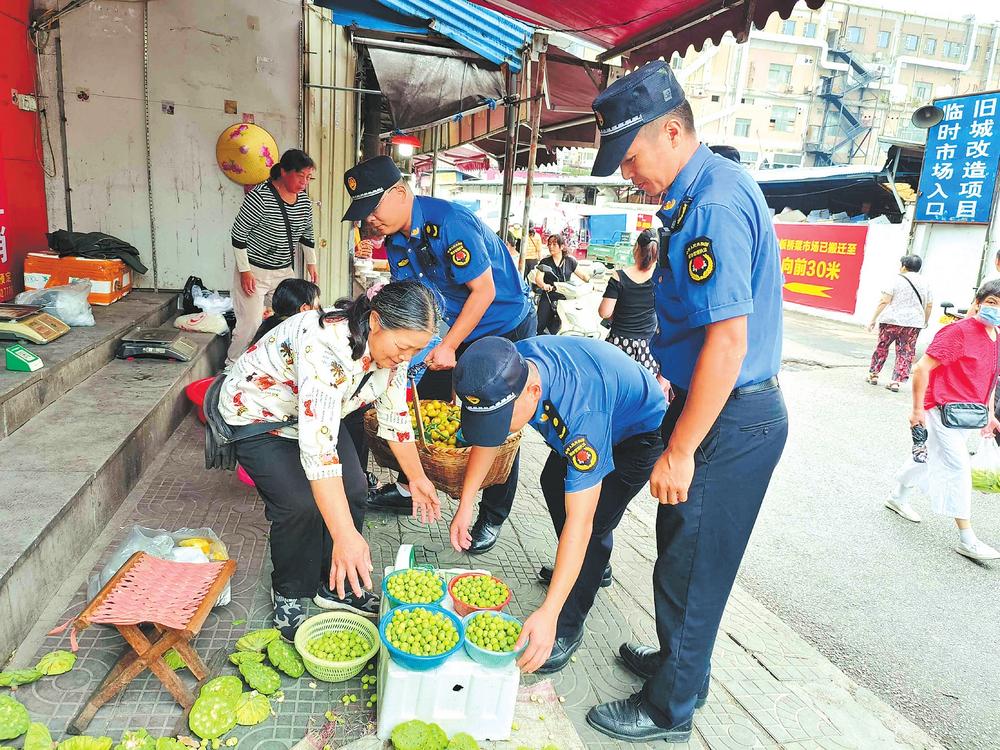 “我們采取延時、錯時,定人、定崗、定責的工作機制,安排執(zhí)法隊員錯時對農(nóng)貿(mào)市場周邊及臨街門店開展逐一檢查,堅決杜絕部分商戶、流動攤販出店經(jīng)營、占道經(jīng)營和擺放遮陽傘阻擋過道等行為?!痹诮瘗樎繁眰?cè)花板橋菜市場及花鳥路周邊,區(qū)城管局五里牌中隊通過采用錯時執(zhí)法和取締一批、歸市一批、疏導(dǎo)一批的辦法,在花鳥路附近的南北樓設(shè)立臨時疏導(dǎo)區(qū),為自產(chǎn)自銷的菜農(nóng)創(chuàng)造合法的經(jīng)營地點,通過耐心宣傳相關(guān)政策規(guī)定,主動幫助商戶搬移占道物品等文明執(zhí)法方式,工作得到廣大商戶和流動攤販的理解及市場周邊百姓的支持。