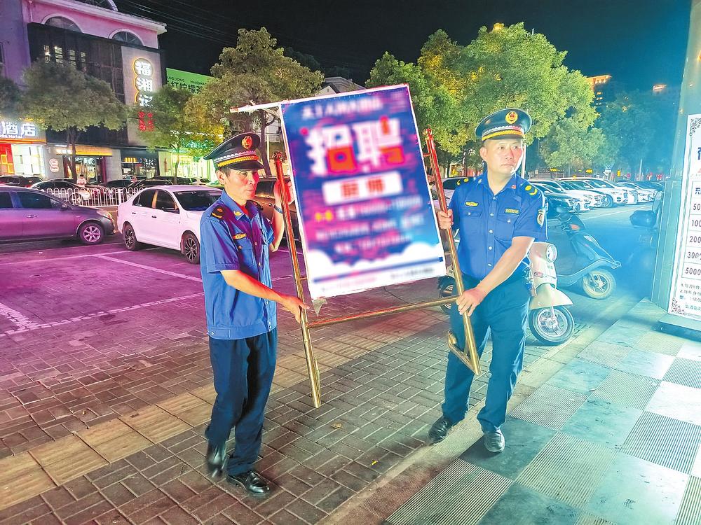 夏季是夜宵燒烤攤點店外經(jīng)營、流動瓜果散販增多的高峰季節(jié),使得夜間城市管理難度加大?!袄习?,廣告牌不能占道擺放,我們幫您搬進店內(nèi)!”8月25日晚8點,夜幕來臨,在磨子山南路,路燈照亮了岳陽樓區(qū)城管委城管三大隊執(zhí)法隊員忙碌的身影,他們正在對夜間人流量較大、群眾反復(fù)投訴的重點難點路段和區(qū)域進行巡查管控,嚴防夜市出店經(jīng)營、露天燒烤、油煙污染及夜間施工場地揚塵污染、違規(guī)渣土車無證運輸?shù)葐栴}發(fā)生。