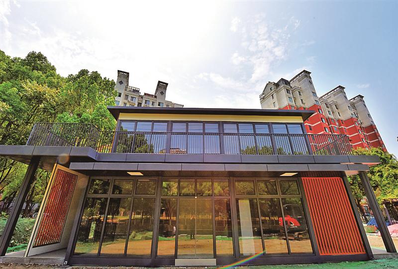 新吳區(qū)住建局相關(guān)負責人介紹,城市驛站建筑面積384平方米,是一座多功能的裝配式建筑,其基礎(chǔ)采用混凝土預(yù)制基礎(chǔ)標準生產(chǎn),建筑整體熱浸鍍鋅防腐,內(nèi)外立面全部采用干法施工,主體結(jié)構(gòu)件采用榫卯工藝進行裝配,施工現(xiàn)場無焊接處理,構(gòu)件連接緊密,結(jié)構(gòu)輕巧,保證建筑使用壽命。相較于傳統(tǒng)驛站需要3-6個月的建設(shè)周期,該驛站采用類似“搭積木”裝配式模塊化建設(shè),所有零部件采用工廠標準化生產(chǎn),組裝過程不產(chǎn)生建筑垃圾與揚塵,施工周期僅為45天,極大地降低了安裝過程中對周邊環(huán)境、居民生活的影響。