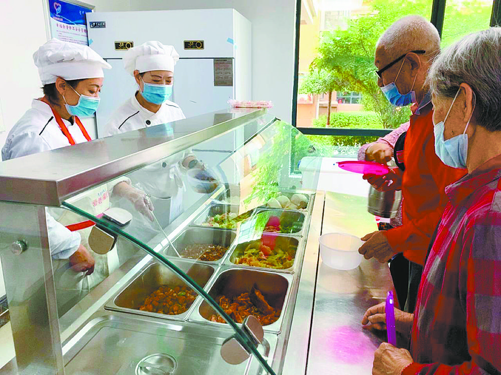 老人們在古城臺(tái)街道王府花園助餐服務(wù)點(diǎn)取餐。古城臺(tái)街道辦事處供圖