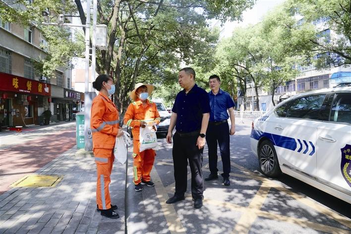 宜都市城市管理執(zhí)法局黨組書記、局長(zhǎng)黃志華(右二)為環(huán)衛(wèi)工人“送清涼”