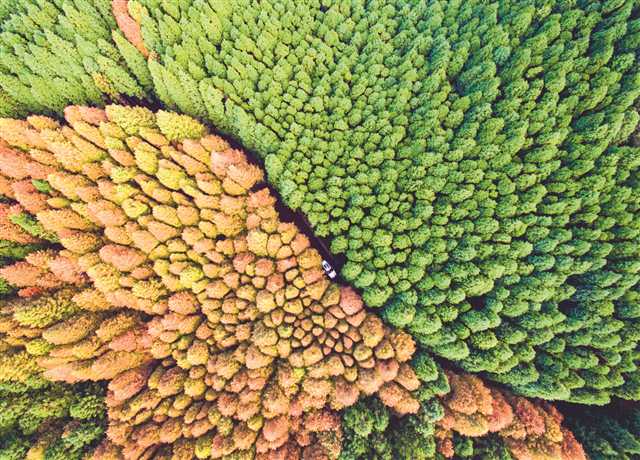 圖4:山王坪喀斯特國家生態(tài)公園實施石漠化治理,依托地形種植水杉和柳杉,在秋季形成了“春秋同框”的彩林景觀。攝/汪新