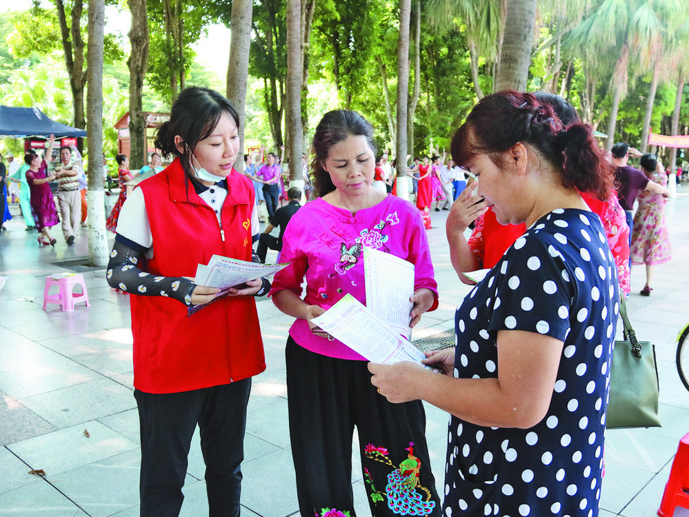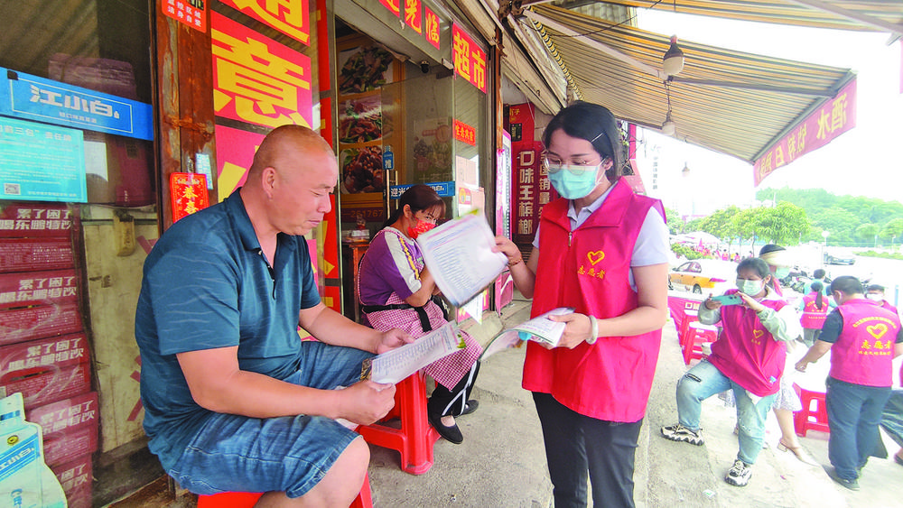 志愿者向居民宣傳創(chuàng)建文明城市相關(guān)知識。