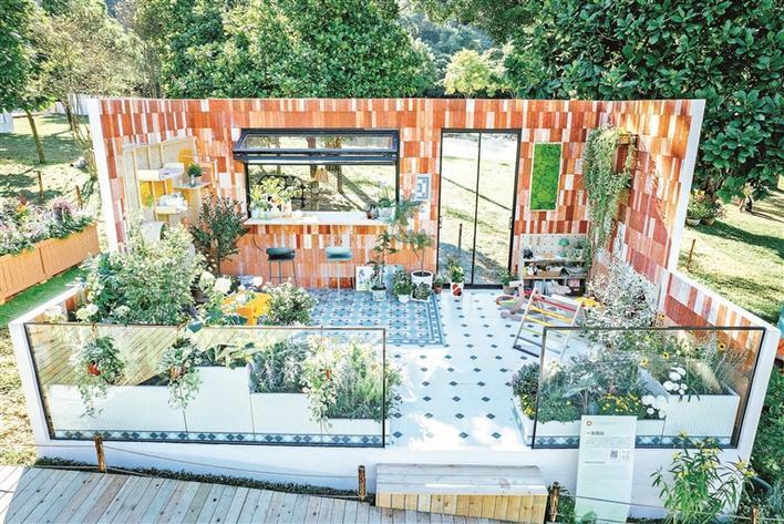 “一米陽光”陽臺花園通過高低層次分明的積木花箱、通透開敞的休閑吧臺,結(jié)合陶土磚立面和嶺南文化特色花磚鋪裝等自然材料,搭配活潑明快、綠意盎然的植物,兒童和寵物專屬的定制家具,營造溫馨的家庭親子陽臺。