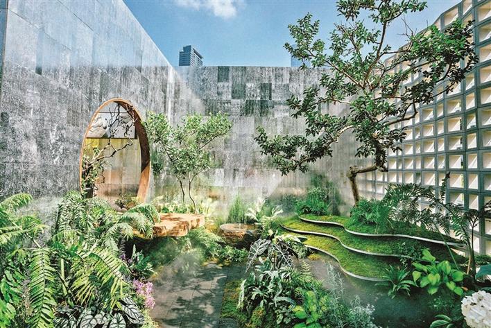 據(jù)介紹,“方寸之間”陽臺花園透過兼具閱讀室與茶室的半室內(nèi)空間的框景視窗,使視線延伸至遠(yuǎn)方;樹干的堅韌與苔蘚的柔軟相互交融,繪成一幅生機(jī)勃勃的園景。陽臺花園中使用的電鍍石材、科技空心磚、與太陽能燈、回收瓦 片、卵石路結(jié)合,數(shù)字龍華印象與禪意空間的景觀形成強(qiáng)烈的對比,禪意與科技、當(dāng)下與未來合二為一,在方寸之間獲得無限可能。