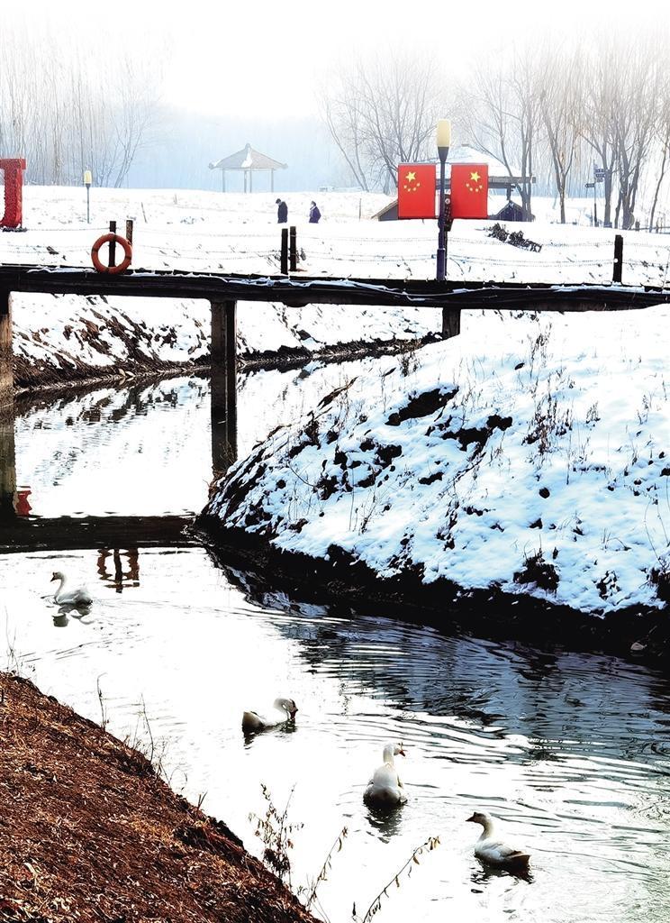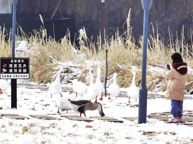 前幾日一場瑞雪,銀灘濕地內(nèi)銀裝素裹。記者午后采訪時看到,一湖碧水靜如明鏡,數(shù)十只鴛鴦有的相擁一起享受著陽光,有的則在湖中央游來游去。木質(zhì)棧道上的積雪已被清掃,蜿蜒著向東西方向延伸。一群家鵝悠閑地在不遠處歡叫,幾處涼亭、三五名游客……雪中的濕地顯得格外安寧、祥和。
