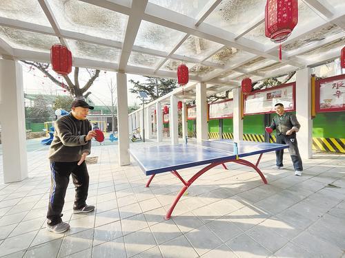 2月22日一早,團(tuán)結(jié)里社區(qū)小廣場上,63歲的市民蔣艷麗和鄰居在球臺上打起乒乓球。