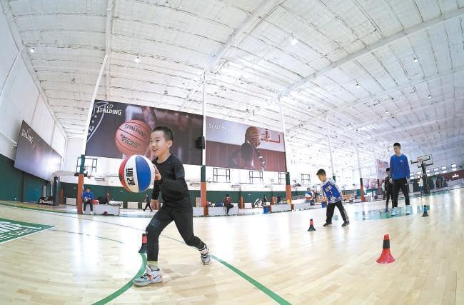 斯伯丁籃球館內(nèi),既有齊腰高的孩子在跟著教練學(xué)習(xí)如何運(yùn)球,也有青年人在球場上你來我往激戰(zhàn)正酣。這里是北京市第一個由國際品牌“斯伯丁”冠名的球館,場館里有4個標(biāo)準(zhǔn)籃球場,不僅有看臺,還配置了高清攝像系統(tǒng)和環(huán)繞立體音效系統(tǒng),能夠即時直播、下載,還有專業(yè)的燈光照明。
