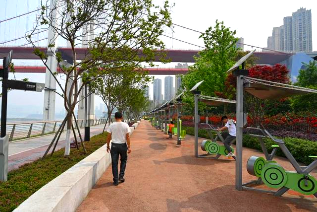 過(guò)去,橋下空地有時(shí)用于停放車輛、栽種綠植;更多時(shí)候,它們被“荒”著,規(guī)劃學(xué)界稱之為城市“剩余空間”或“灰空間”。而今在重慶市九龍坡區(qū),橫跨長(zhǎng)江的鵝公巖大橋下坐落著生機(jī)盎然的九龍灘廣場(chǎng)。市民可在1000平方米的智能健身區(qū)體驗(yàn)太陽(yáng)能充電的健身設(shè)施,也可在三道貫通的江邊步道親近自然、游玩休憩。