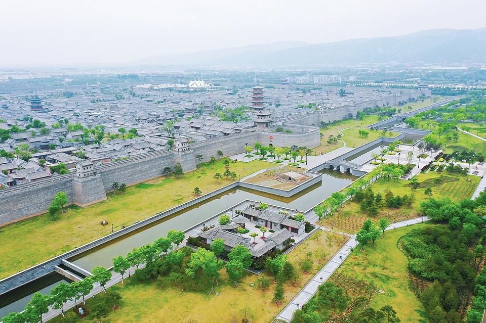 5月9日,遠(yuǎn)眺之下,太原古縣城內(nèi)外,綠樹環(huán)抱,一派綠意盎然的美麗景象。入夏以來,古縣城景區(qū)與古城公園的生態(tài)美景遙相呼應(yīng),處處生機(jī)勃勃。(記者 阮洋 攝)