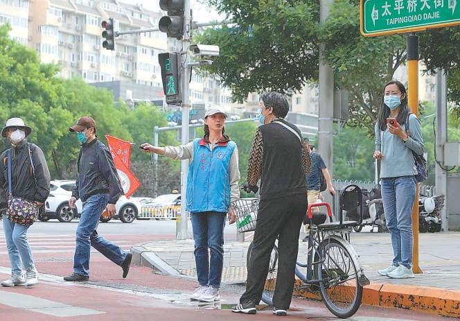 “現(xiàn)在是紅燈,請(qǐng)您站在白線外稍作等候。”來自北京首都創(chuàng)業(yè)集團(tuán)有限公司和東直門街道東外大街社區(qū)的8名青年志愿者正在有序引導(dǎo)過往行人。