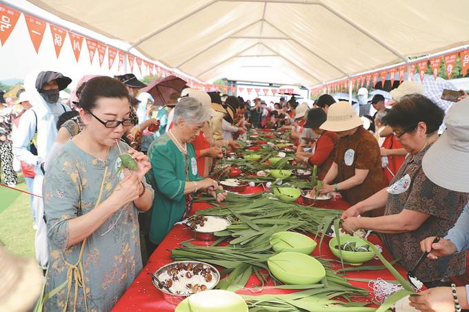 徐州市在大龍湖畔開(kāi)展端午民俗文化、民俗產(chǎn)品展活動(dòng)。圖為包粽子比賽。李廣富 攝