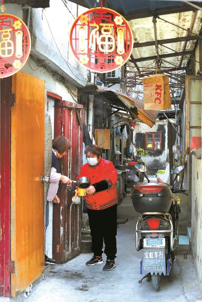 袁筱鳳(左)給鄰里加熱水。巷口的福字,每年都換新的。