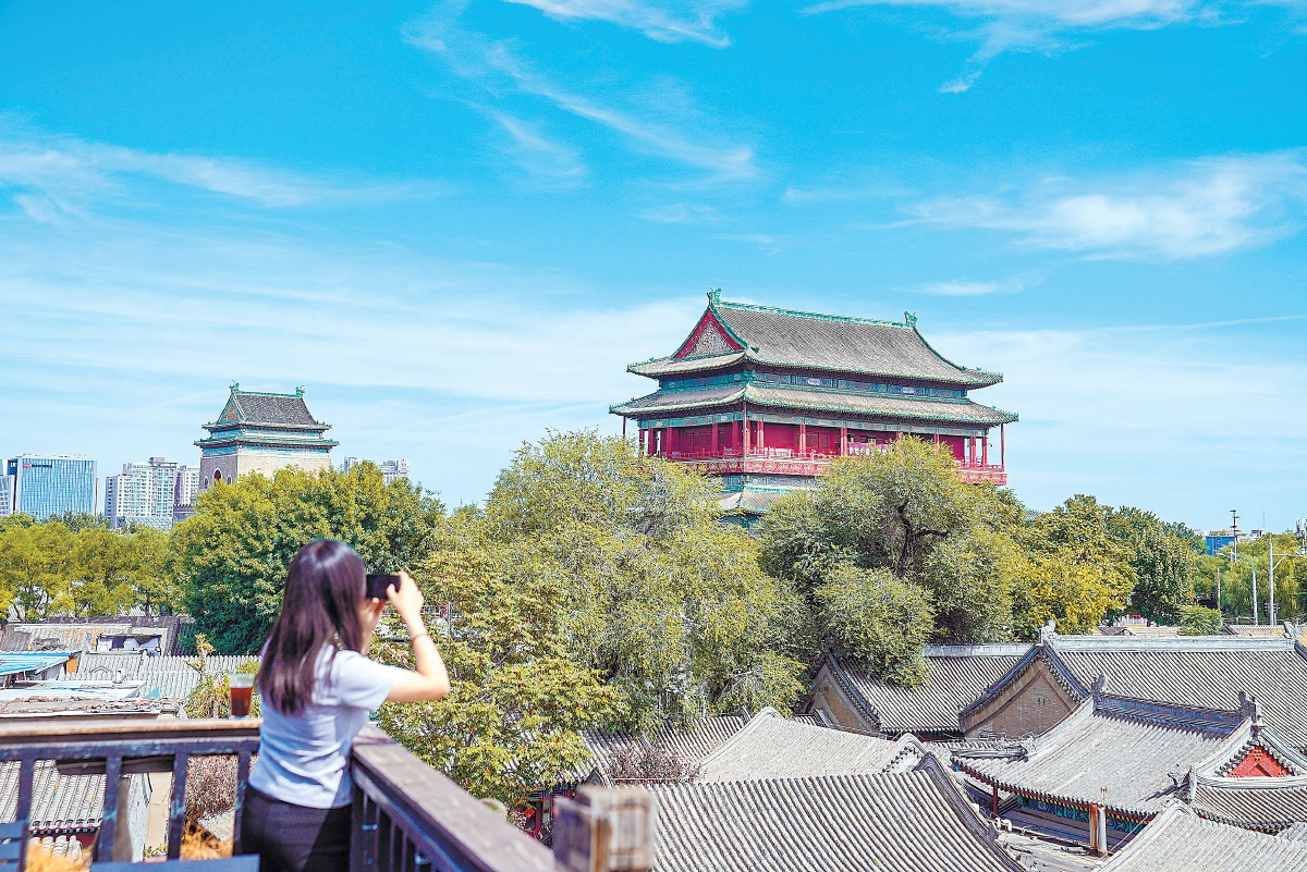初秋,站在鼓樓底下抬頭看,云卷云舒,紅墻灰瓦,重檐屋頂?shù)木G琉璃剪邊在藍天下閃閃發(fā)亮。鼓樓內(nèi),一場數(shù)字沉浸展,讓600多歲的古建獲“新生”;隆隆鼓聲,穿過紅墻,伴著悠悠鴿哨;鼓樓外,三岔路口,107路公交緩緩駛過,拍照打卡的游人絡(luò)繹不絕……
