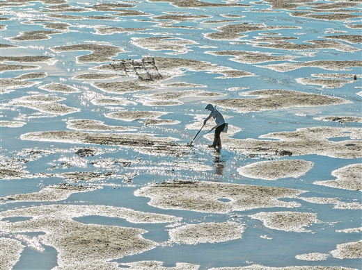 初秋時節(jié),北海濱海國家濕地公園景色如畫。每天清晨或傍晚時分,都有許多漁民到馮家江出??诟浇鼮┩俊摆s?!?。在光影的變化中,辛勤勞作的身影和起伏的潮汐交織在一起,形成一幅和諧的畫卷。