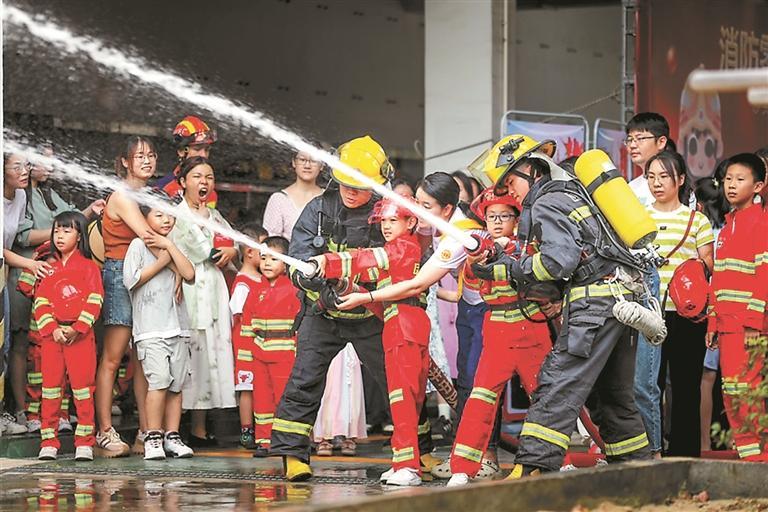 沙頭社區(qū)小朋友體驗(yàn)當(dāng)“消防員”。