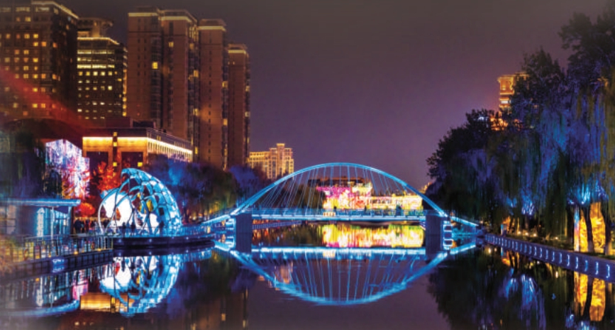 夜品中國風(fēng)。在通惠河的高碑店湖,古風(fēng)建筑倒映在波光粼粼的水面上,七彩菩提古樹、平津古閘、滕隆閣等燈帶構(gòu)成了“御水金環(huán)”夜間景觀,把漕運(yùn)故事娓娓道來。