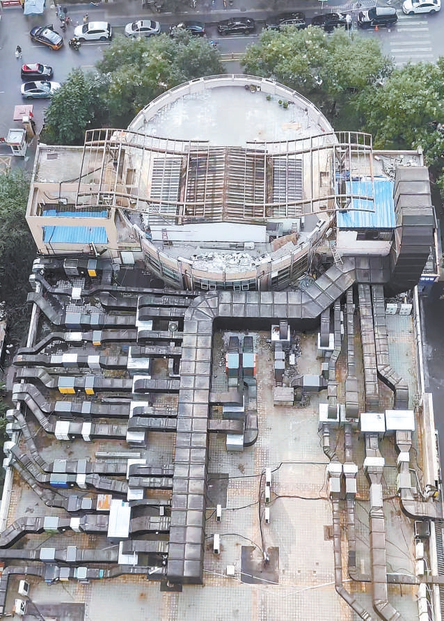 排煙管道、空調(diào)室外機……改造前,各類與餐飲企業(yè)相關(guān)的設(shè)備設(shè)施在百環(huán)家園18號樓西側(cè)商務小樓的樓頂散亂排布。