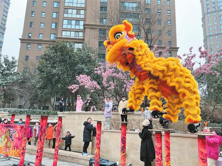 活動(dòng)現(xiàn)場(chǎng),社區(qū)和物業(yè)工作人員精心準(zhǔn)備百余條燈謎懸掛在燈籠下,一排排紅彤彤的燈籠鮮艷喜慶。社區(qū)文藝志愿者團(tuán)隊(duì)的隊(duì)員們身著鮮艷的服裝,隨著喜慶悅耳的鼓點(diǎn),帶動(dòng)現(xiàn)場(chǎng)居民一同起舞,社區(qū)廣場(chǎng)上一派熱鬧景象。寓意著風(fēng)調(diào)雨順、吉祥如意的舞獅表演將現(xiàn)場(chǎng)氣氛推上新的高潮。伴隨著激動(dòng)人心的鑼鼓聲,兩只“雄獅”或騰空盤旋或左右翻滾,神龍擺尾等姿態(tài)被演繹得淋漓盡致。