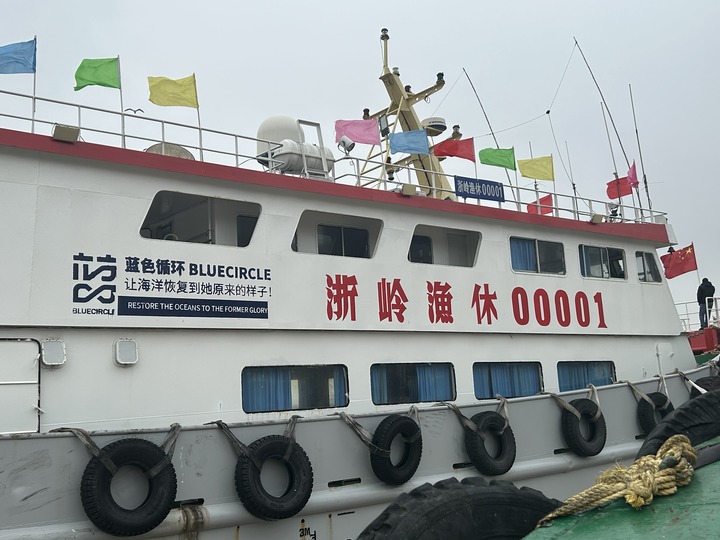 臺州溫嶺一艘休閑漁船上印著“藍色循環(huán)”的標志。記者 黃筱 攝