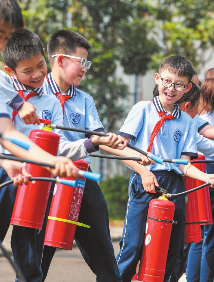 3月6日,學(xué)生們?cè)诤?谑兄行W(xué)生安全應(yīng)急綜合演練基地參與消防安全應(yīng)急演練。在學(xué)習(xí)使用滅火器環(huán)節(jié),孩子們認(rèn)真學(xué)習(xí),相互交流指正動(dòng)作要領(lǐng)。