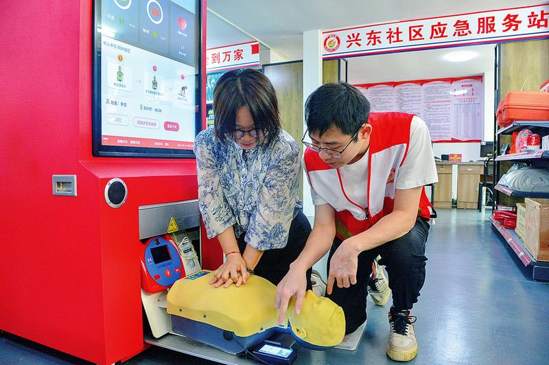 在興東社區(qū)應(yīng)急服務(wù)站,廣西安全生產(chǎn)科學(xué)研究院的工作人員利用心肺復(fù)蘇急救培訓(xùn)一體機(jī)開(kāi)展示范教學(xué),并邀請(qǐng)居民實(shí)操訓(xùn)練。記者 黃維業(yè) 攝