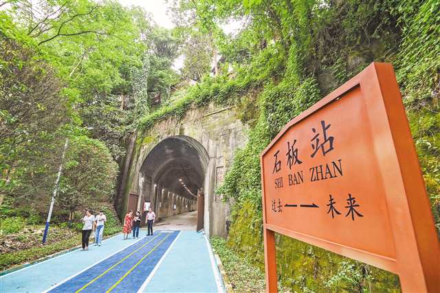 該文化公園由原襄渝鐵路石板隧道廢舊遺址打造而成,包括童趣互動(dòng)、文化驛站和運(yùn)動(dòng)健身3個(gè)主題區(qū)域。隧道內(nèi)有鐵路主題浮雕、復(fù)古式候車站臺(tái)、綠郵箱等舊時(shí)光特色文化打卡點(diǎn),一路向前,有沙池、秋千等兒童游樂設(shè)施。公園另一端,是五人制足球場、乒乓球場、羽毛球場等。