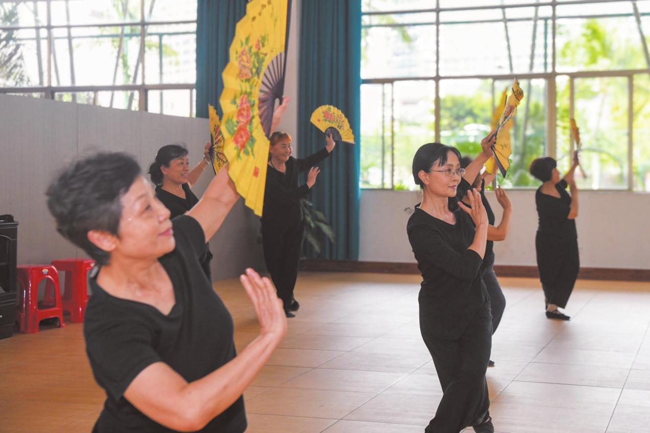 在四季華庭一期業(yè)主文化中心內,小區(qū)業(yè)主正跟隨著音樂練習扇子舞。