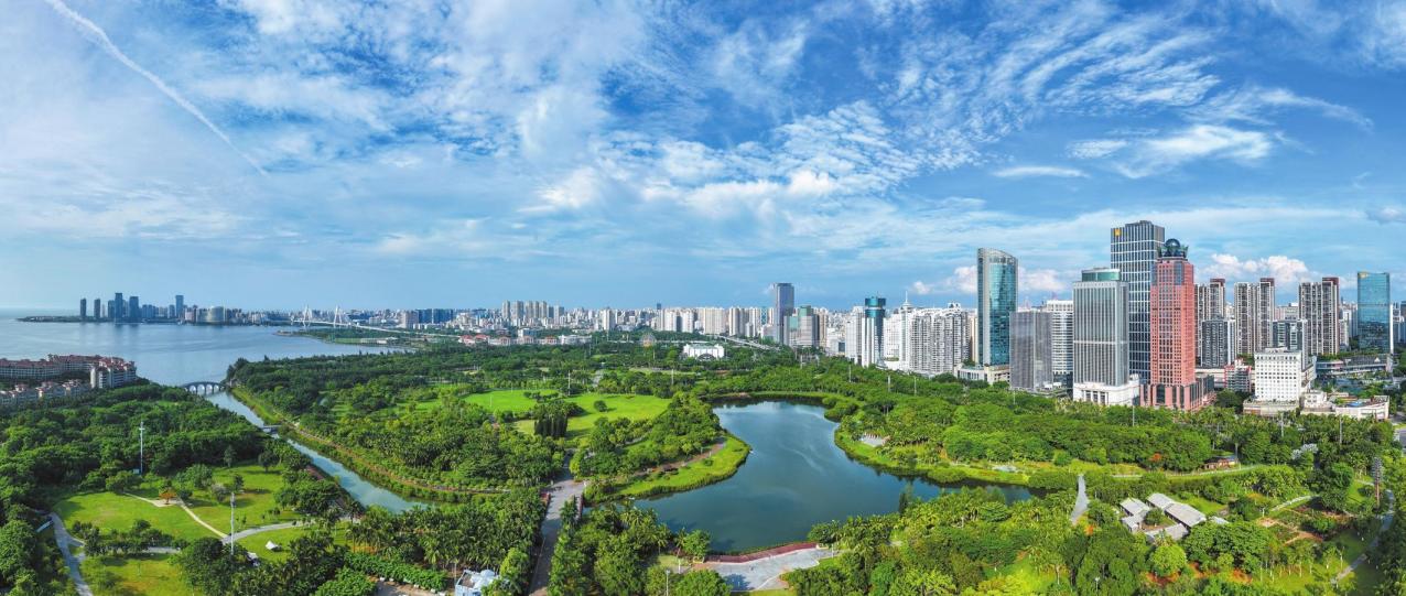 5月26日,俯瞰海口灣一帶,海碧天清,滿目蔥綠,一幅人與自然和諧共生的美好城市畫卷躍然眼前。